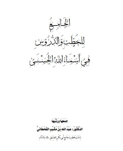 هَذِهِ مَجْمُوعَةُ خُطَبٍ وَدُرُوسٍ أَلْقَيْتُ أَكْثَرَهَا عَلَى المِنْبَرِ وَفِي المِحْرَابِ، أُقَدِّمُهَا بَيْنَ يَدَيْكَ، وَأَسْمَيْتُهَا: (الجَامِعُ لِلخُطَبِ وَالدُّرُوسِ فِي أَسْمَاءِ اللهِ الحُسْنَى)، وَسَبَبُ تَسْمِيَتِهَا بِ (الجَامِعِ) لِكَوْنِ الإِمَامِ يَسْتَطِيعُ أَنْ يُلْقِيَهَا دَرْسًا أَوْ خُطْبَةً دُوْنَ تَكَلُّفٍ.